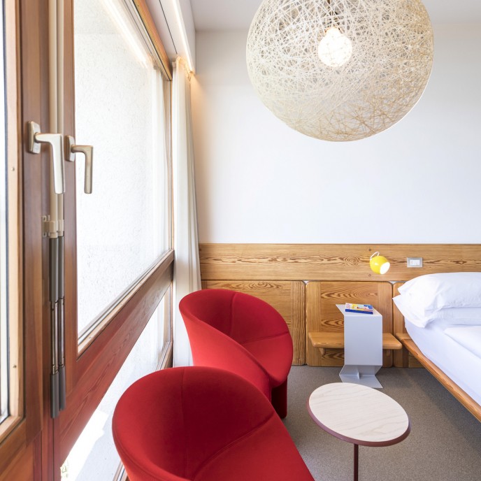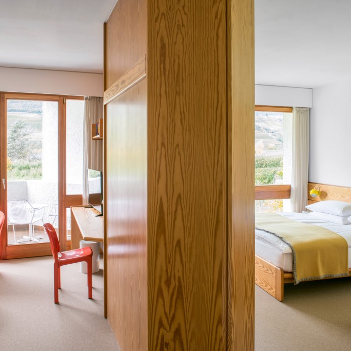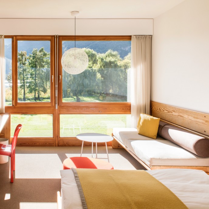 »Als eines der wenigen Hotels bietet das Seehotel Ambach mit gleich zwei Badestegen direkten Zugang zum Kalterer See – hinzu kommt die einzigartige Architektur des Gebäudes, die durch ein grandioses Interiordesign im Stil der Siebziger ergänzt wird.«