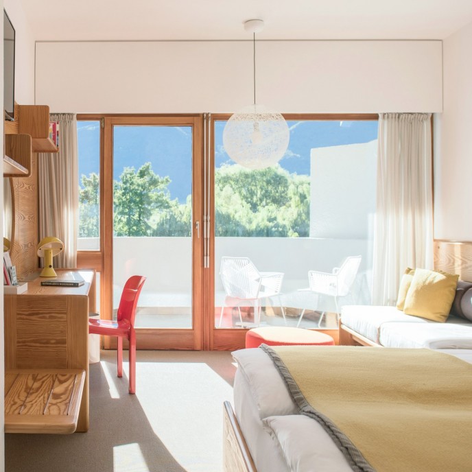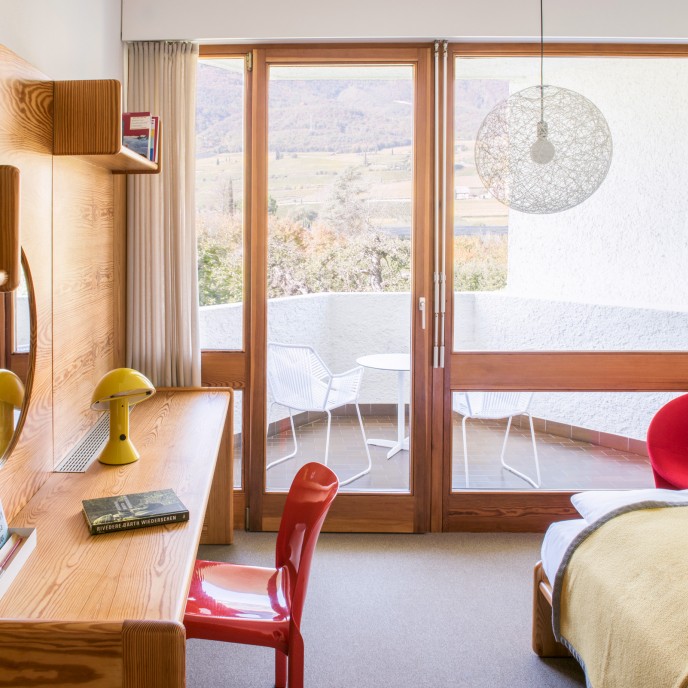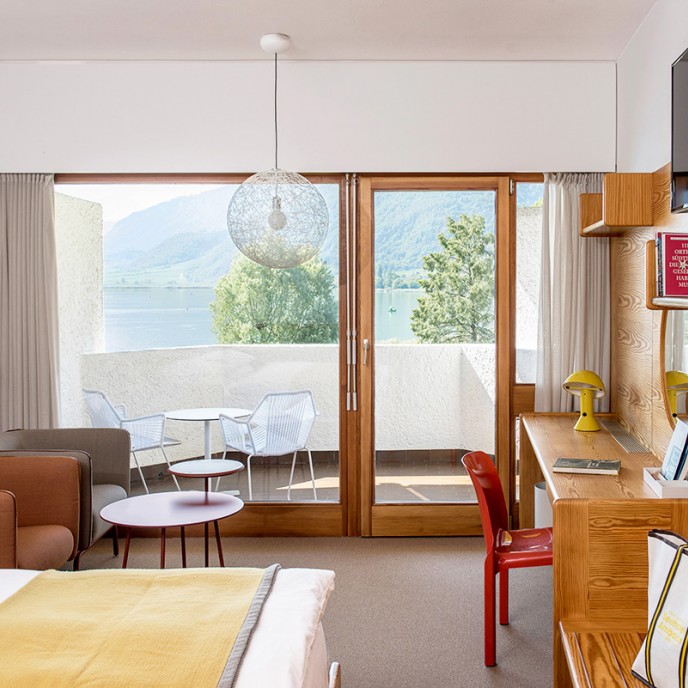 »Als eines der wenigen Hotels bietet das Seehotel Ambach mit gleich zwei Badestegen direkten Zugang zum Kalterer See – hinzu kommt die einzigartige Architektur des Gebäudes, die durch ein grandioses Interiordesign im Stil der Siebziger ergänzt wird.«