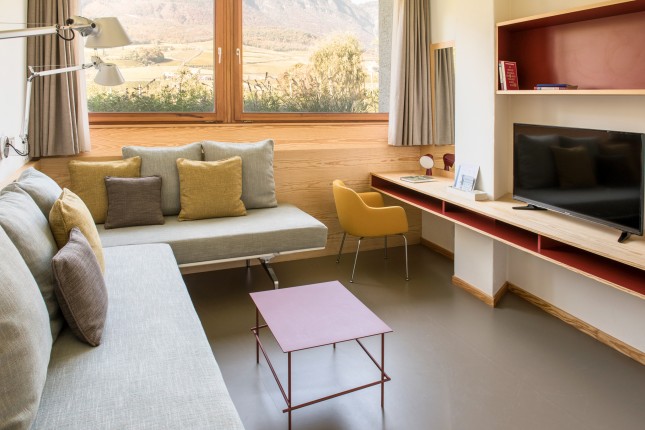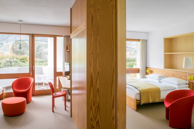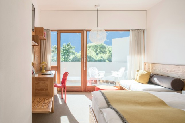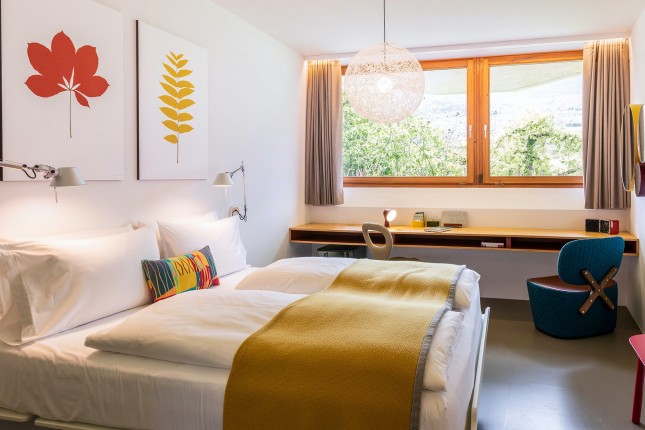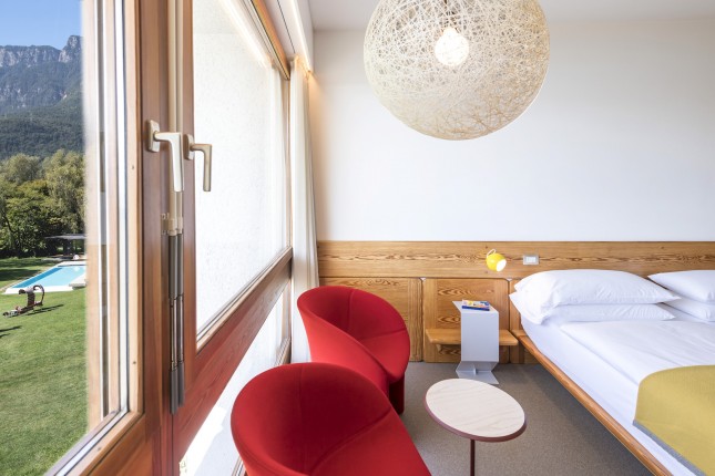 Le 28 camere e 4 suite dall'atmosfera Seventies, tutte con vista lago o giardino, sono luoghi di ritiro e di ispirazione, che portano l’impronta degli elementi acqua, aria e terra; questi elementi sono stati ripresi per colore e forma da Barth anche per gli interni.